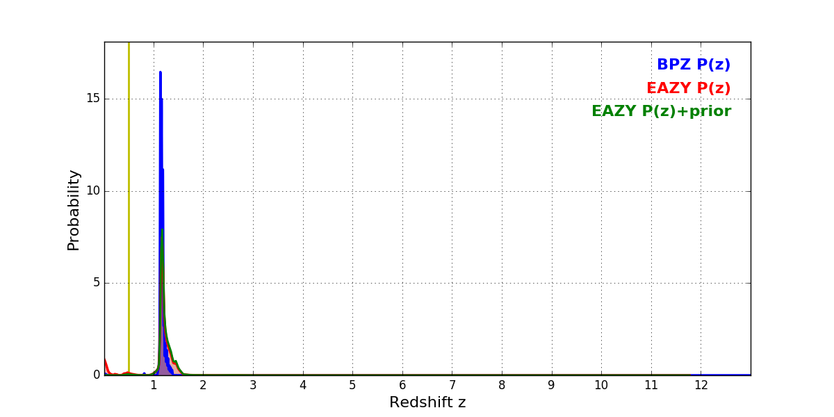 In P(z) plots: Yellow lines mark the cluster redshift z = 0.505,