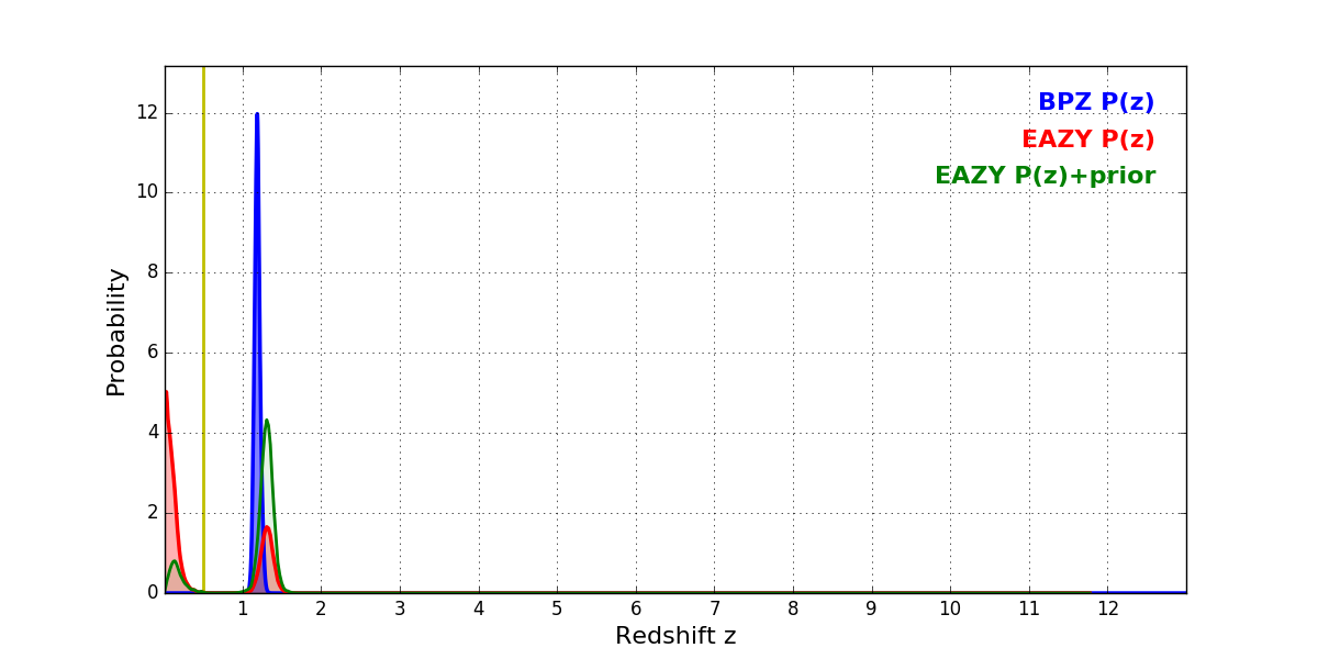In P(z) plots: Yellow lines mark the cluster redshift z = 0.505,