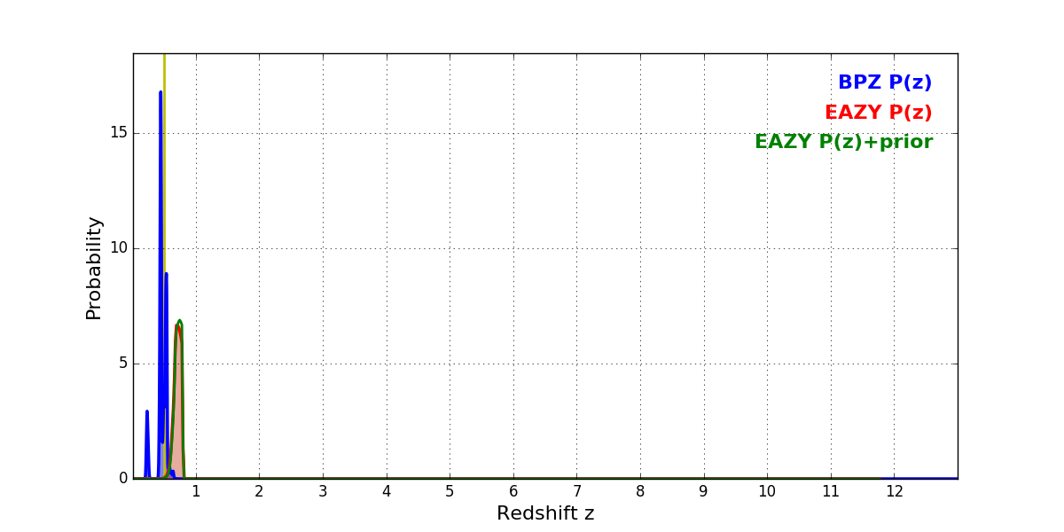 In P(z) plots: Yellow lines mark the cluster redshift z = 0.505,