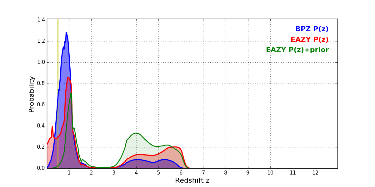 In P(z) plots: Yellow lines mark the cluster redshift z = 0.505,