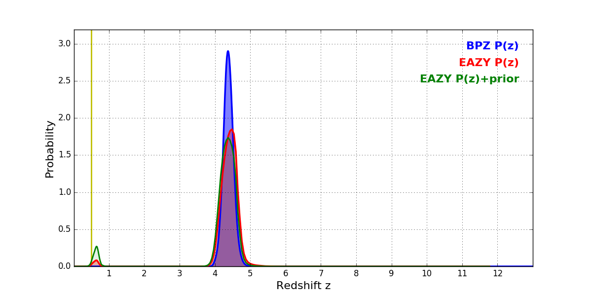 In P(z) plots: Yellow lines mark the cluster redshift z = 0.505,