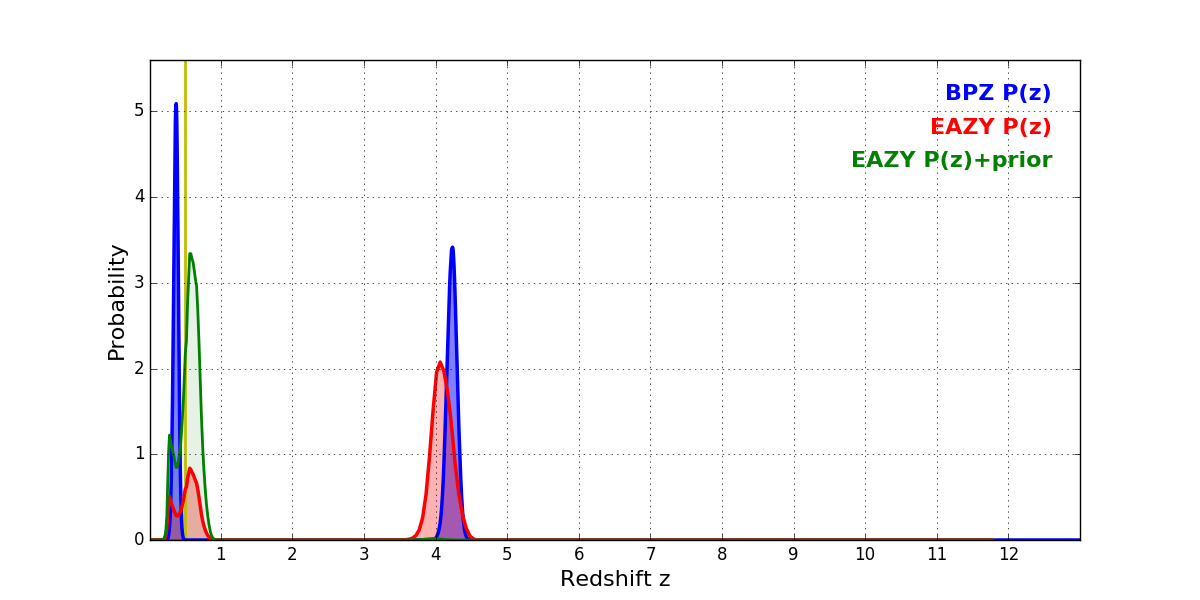 In P(z) plots: Yellow lines mark the cluster redshift z = 0.505,