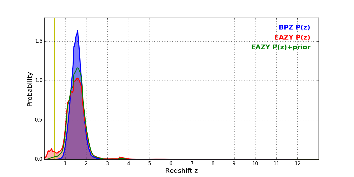 In P(z) plots: Yellow lines mark the cluster redshift z = 0.505,