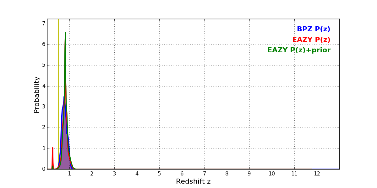 In P(z) plots: Yellow lines mark the cluster redshift z = 0.505,
