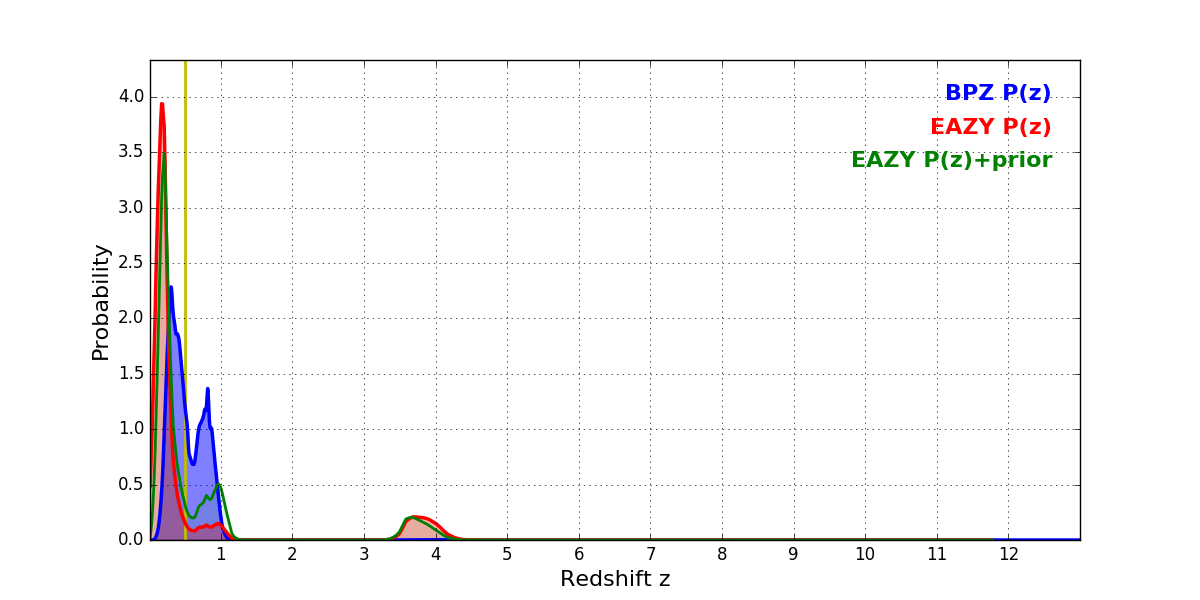 In P(z) plots: Yellow lines mark the cluster redshift z = 0.505,