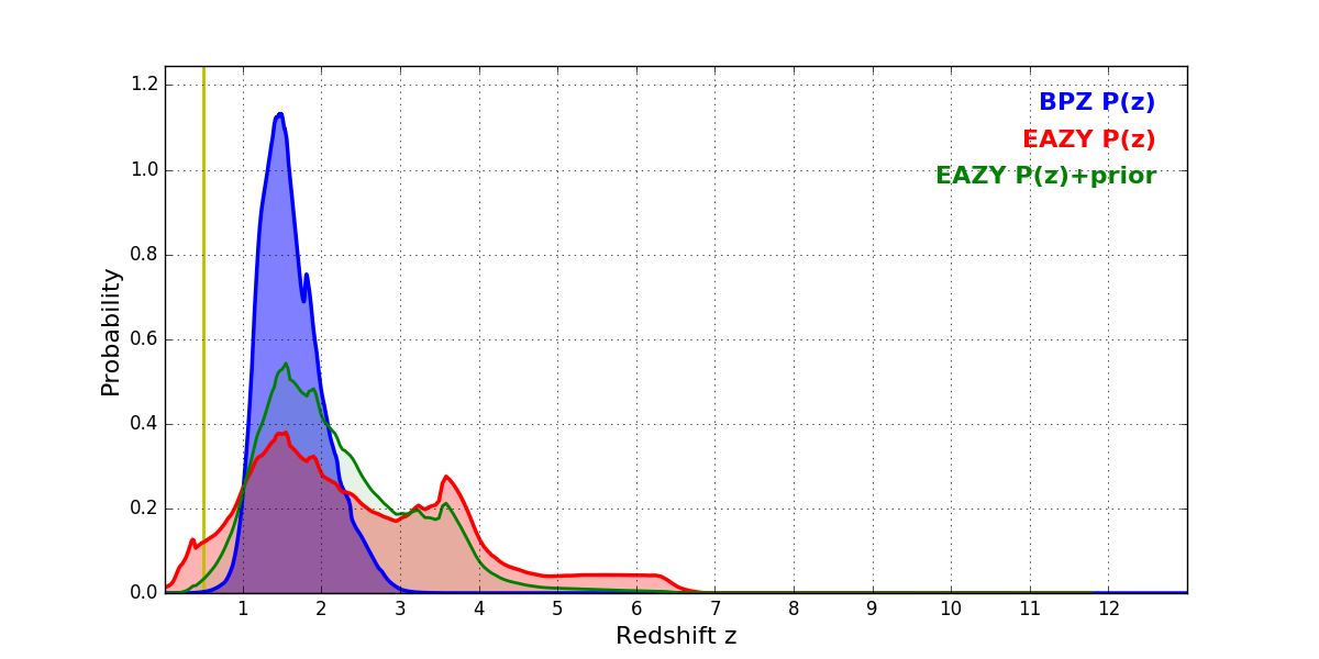 In P(z) plots: Yellow lines mark the cluster redshift z = 0.505,