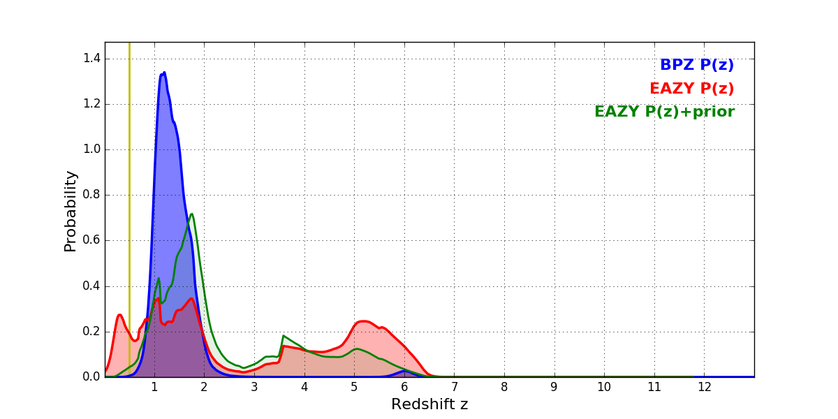 In P(z) plots: Yellow lines mark the cluster redshift z = 0.505,