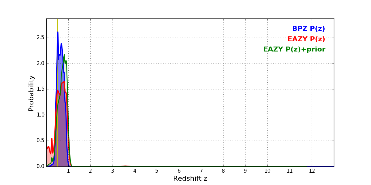 In P(z) plots: Yellow lines mark the cluster redshift z = 0.505,