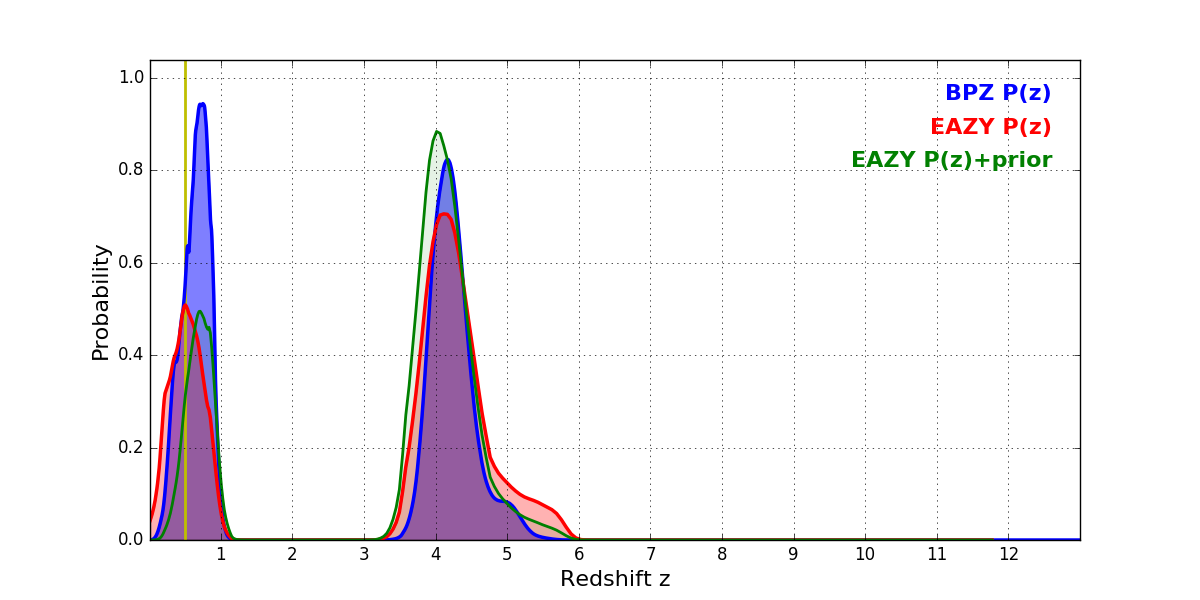 In P(z) plots: Yellow lines mark the cluster redshift z = 0.505,