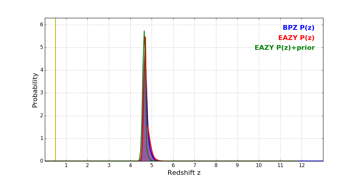 In P(z) plots: Yellow lines mark the cluster redshift z = 0.505,