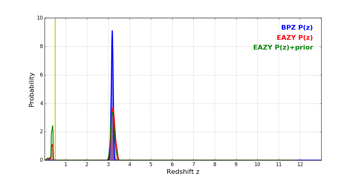In P(z) plots: Yellow lines mark the cluster redshift z = 0.505,