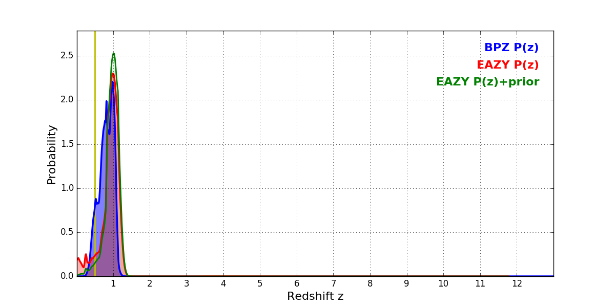 In P(z) plots: Yellow lines mark the cluster redshift z = 0.505,
