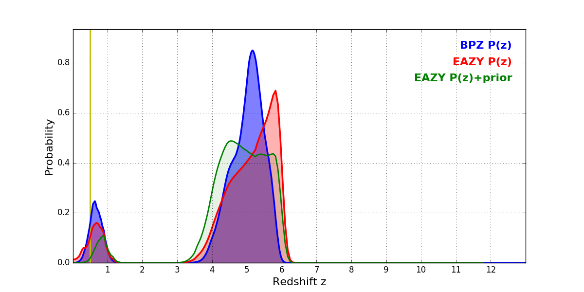 In P(z) plots: Yellow lines mark the cluster redshift z = 0.505,