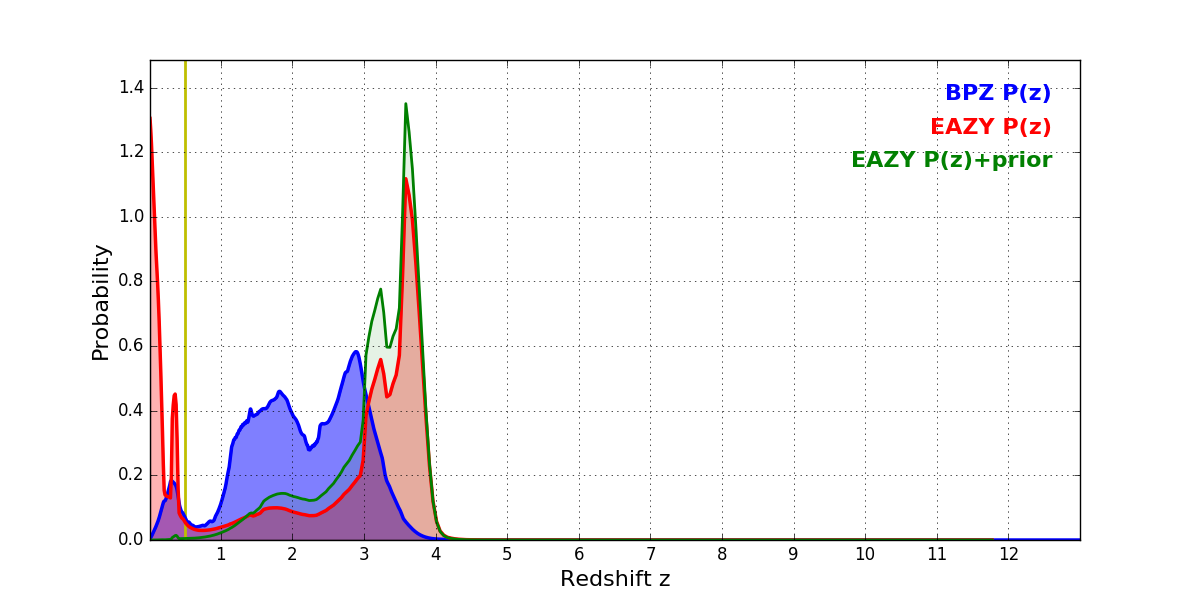 In P(z) plots: Yellow lines mark the cluster redshift z = 0.505,