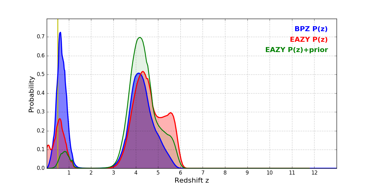In P(z) plots: Yellow lines mark the cluster redshift z = 0.505,