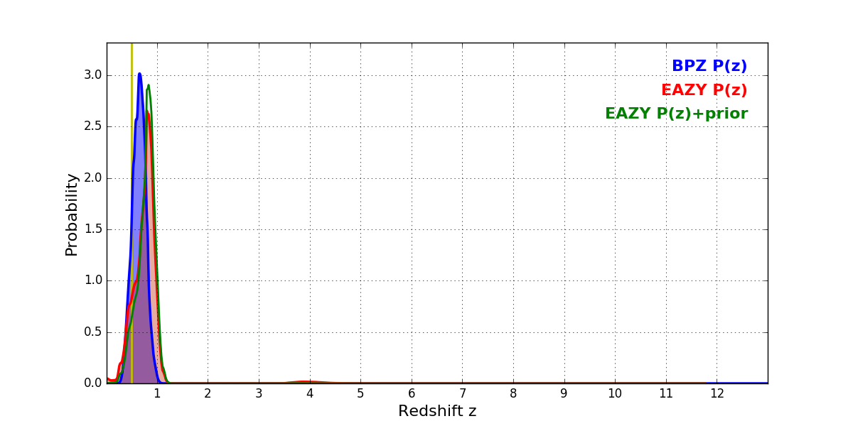 In P(z) plots: Yellow lines mark the cluster redshift z = 0.505,