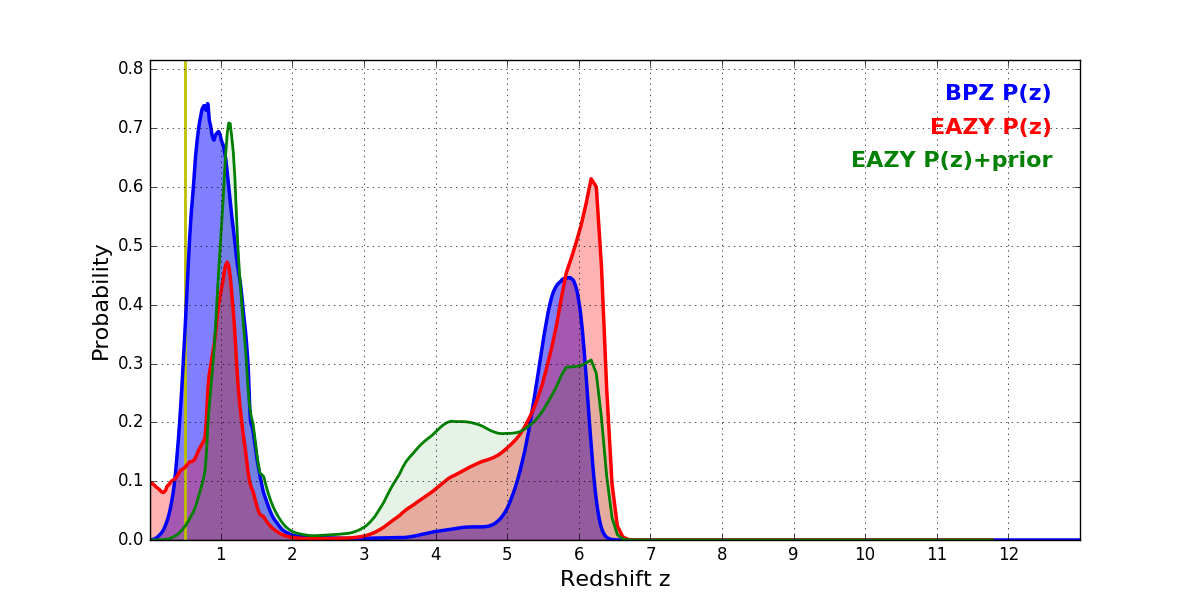 In P(z) plots: Yellow lines mark the cluster redshift z = 0.505,