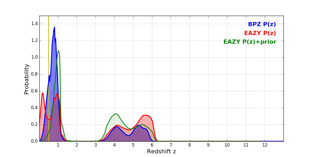 In P(z) plots: Yellow lines mark the cluster redshift z = 0.505,