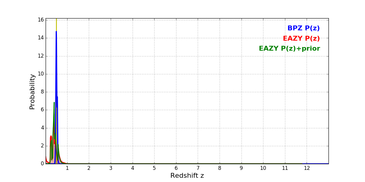 In P(z) plots: Yellow lines mark the cluster redshift z = 0.505,