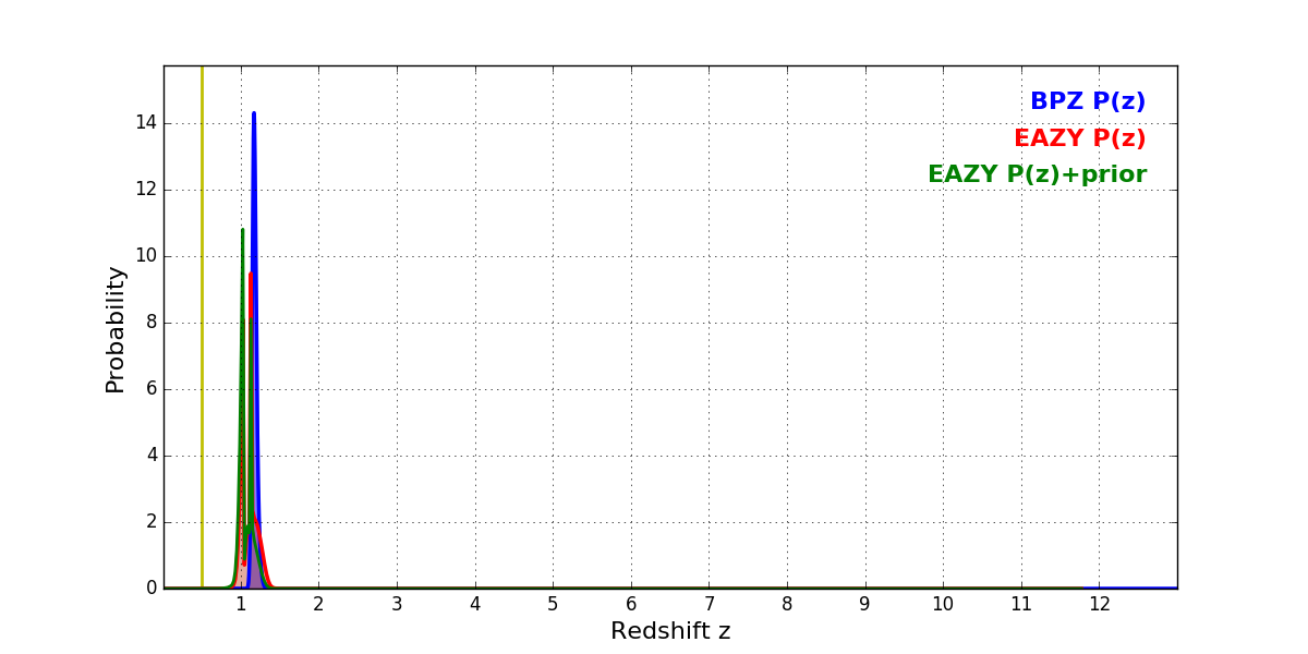 In P(z) plots: Yellow lines mark the cluster redshift z = 0.505,