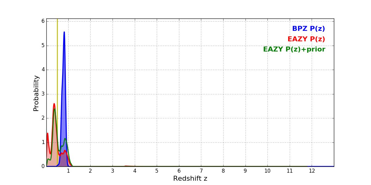 In P(z) plots: Yellow lines mark the cluster redshift z = 0.505,
