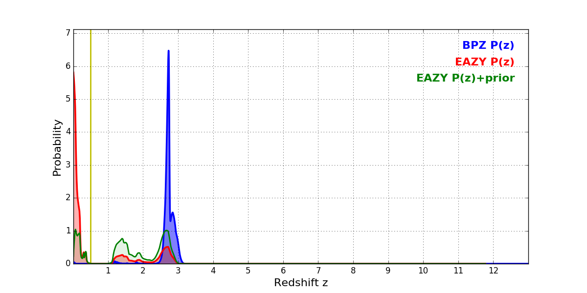 In P(z) plots: Yellow lines mark the cluster redshift z = 0.505,