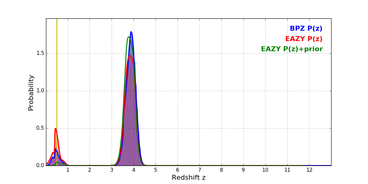In P(z) plots: Yellow lines mark the cluster redshift z = 0.505,