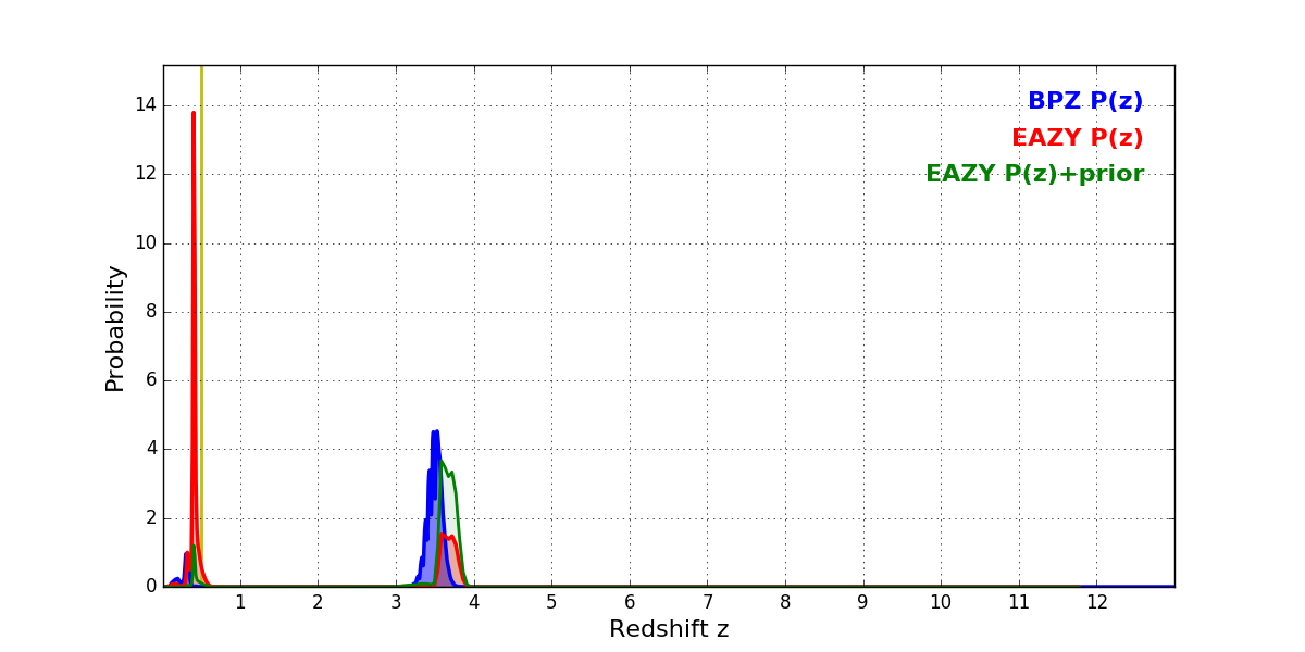 In P(z) plots: Yellow lines mark the cluster redshift z = 0.505,