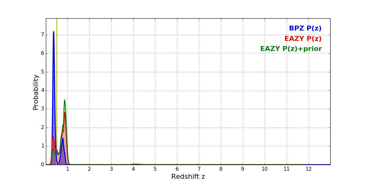 In P(z) plots: Yellow lines mark the cluster redshift z = 0.505,
