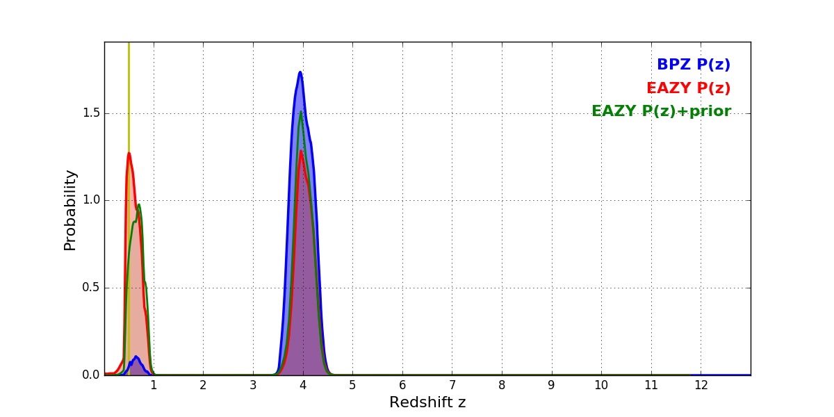 In P(z) plots: Yellow lines mark the cluster redshift z = 0.505,