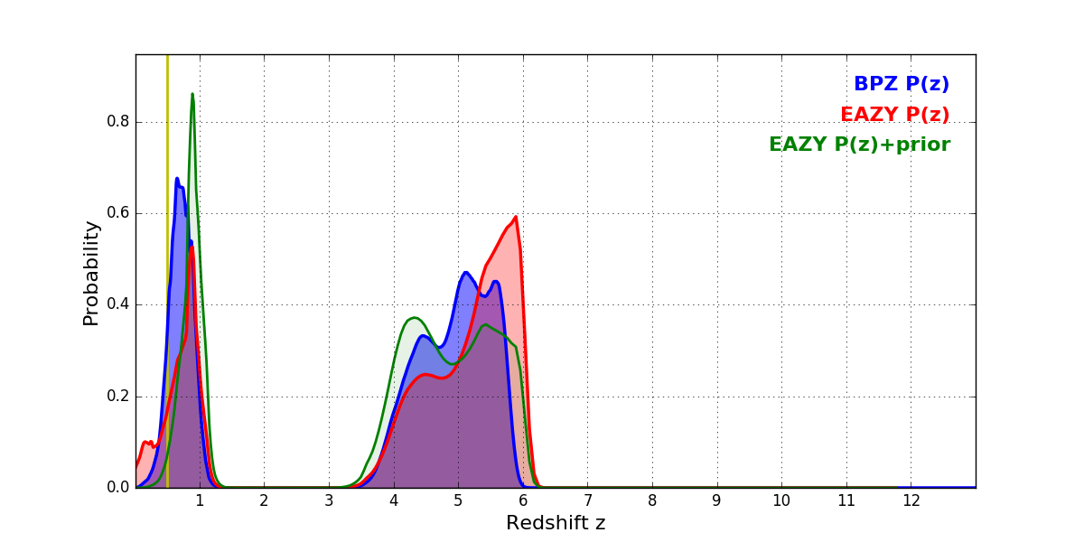 In P(z) plots: Yellow lines mark the cluster redshift z = 0.505,