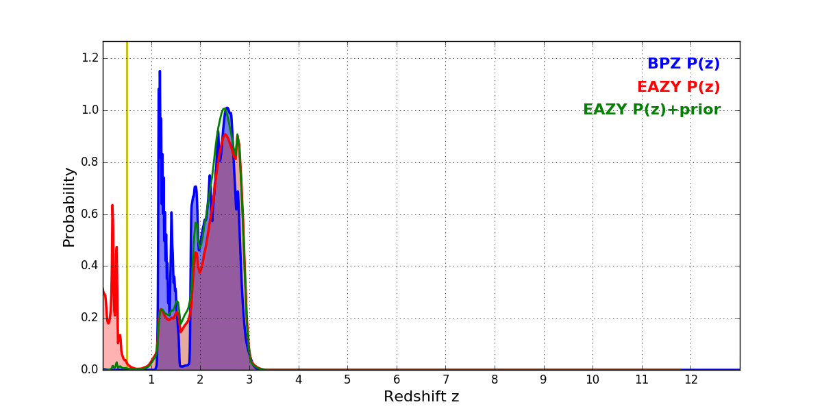 In P(z) plots: Yellow lines mark the cluster redshift z = 0.505,