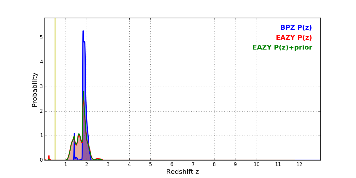In P(z) plots: Yellow lines mark the cluster redshift z = 0.505,