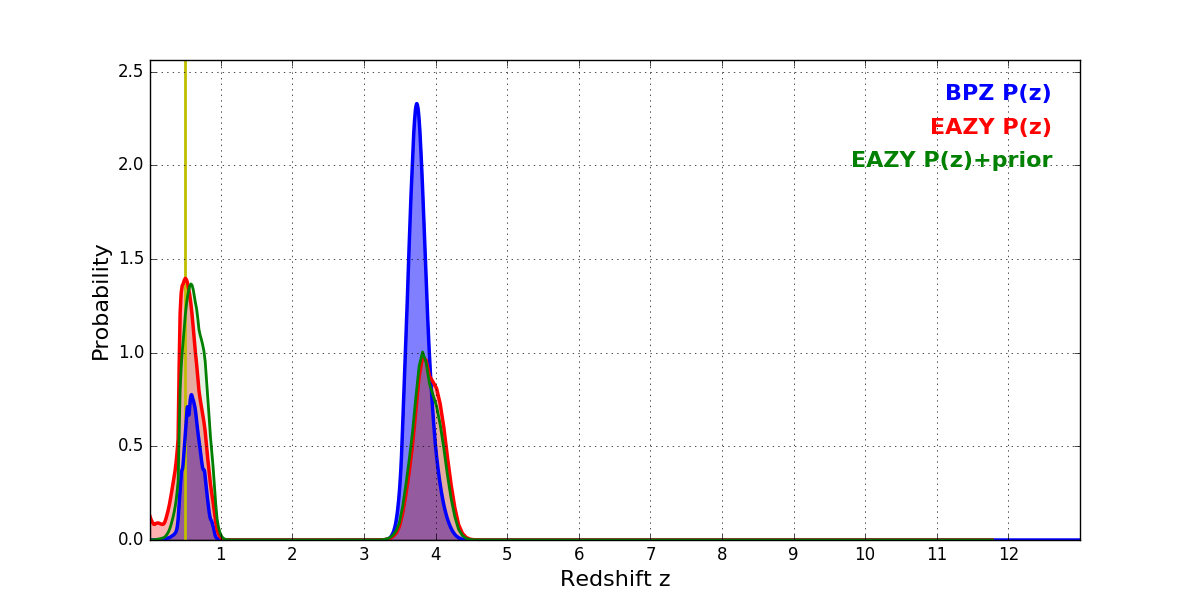 In P(z) plots: Yellow lines mark the cluster redshift z = 0.505,