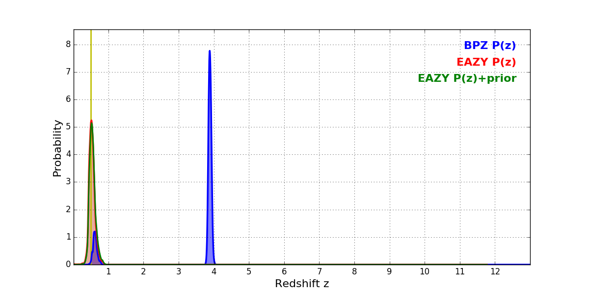 In P(z) plots: Yellow lines mark the cluster redshift z = 0.505,