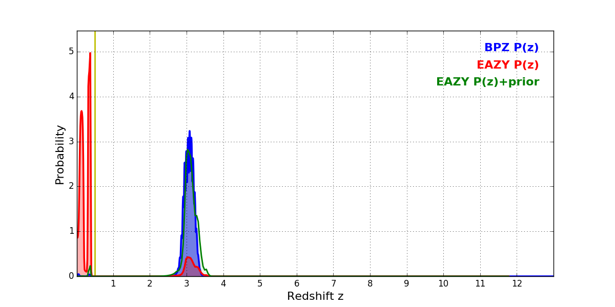 In P(z) plots: Yellow lines mark the cluster redshift z = 0.505,