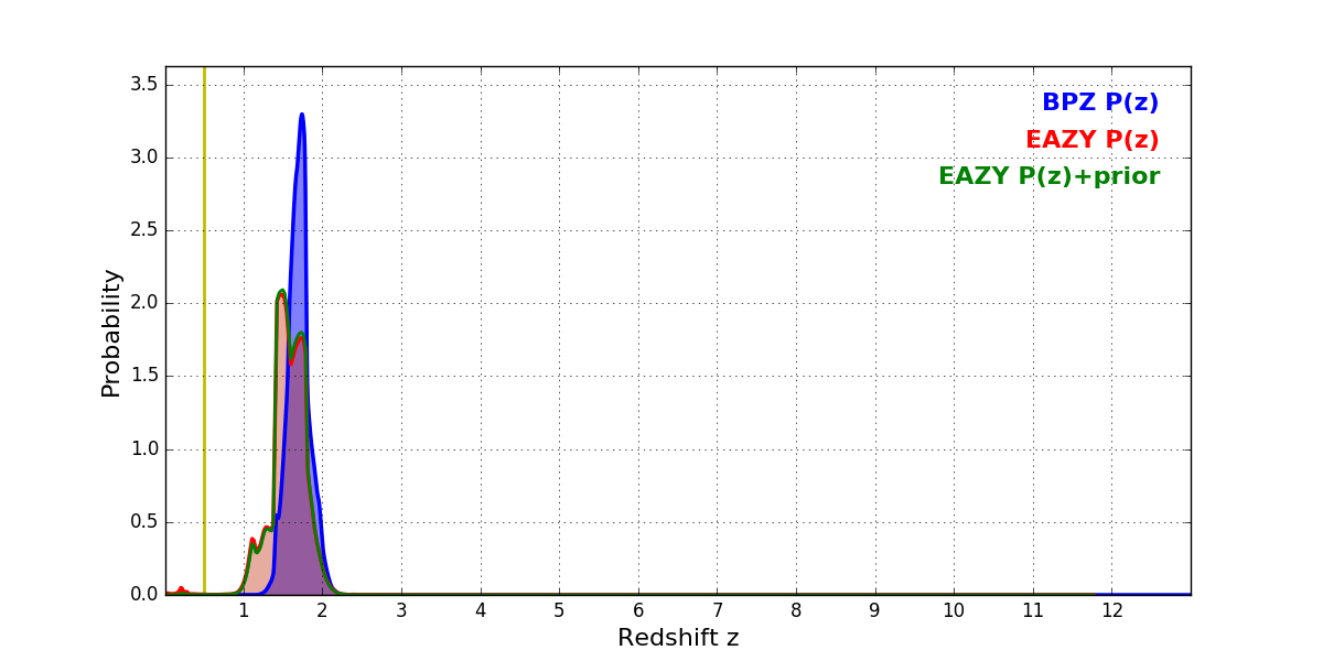 In P(z) plots: Yellow lines mark the cluster redshift z = 0.505,