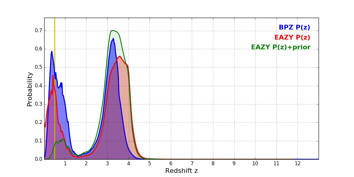 In P(z) plots: Yellow lines mark the cluster redshift z = 0.505,