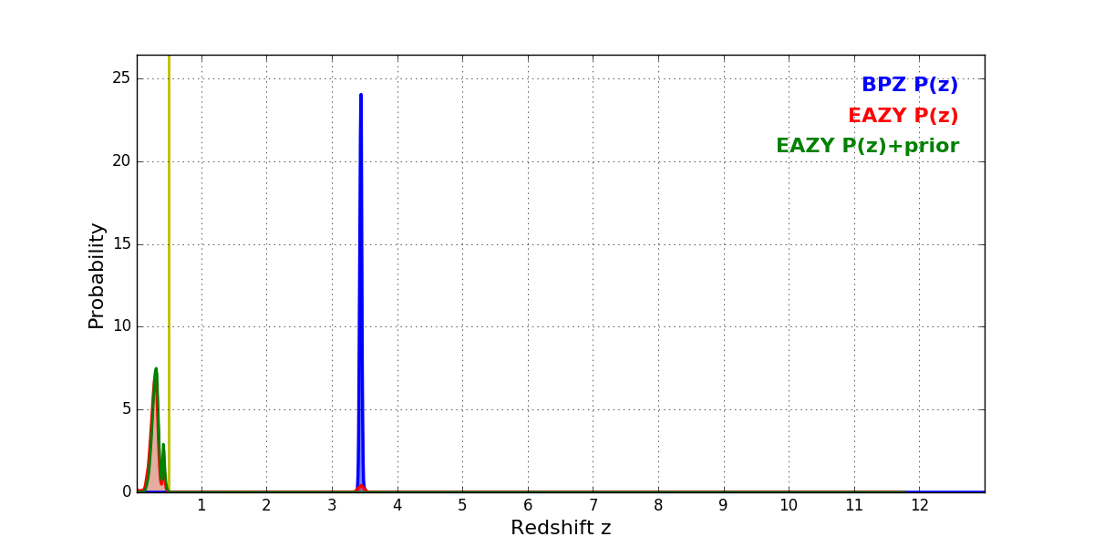 In P(z) plots: Yellow lines mark the cluster redshift z = 0.505,