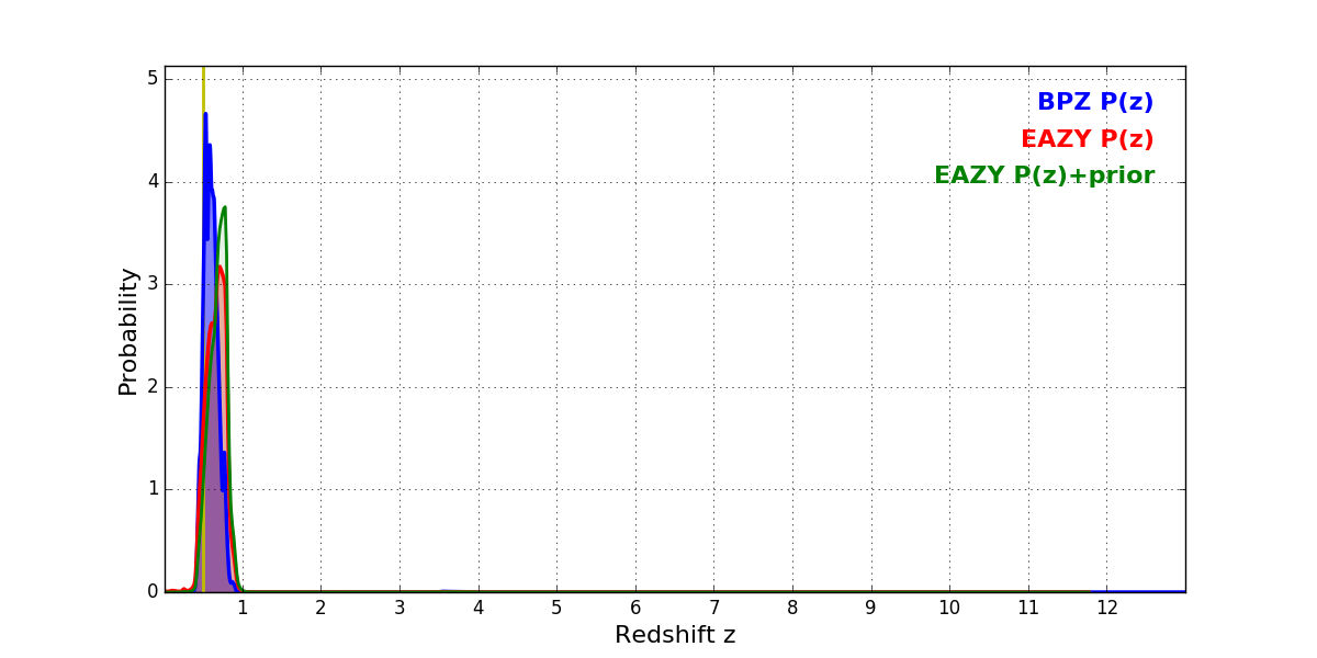 In P(z) plots: Yellow lines mark the cluster redshift z = 0.505,