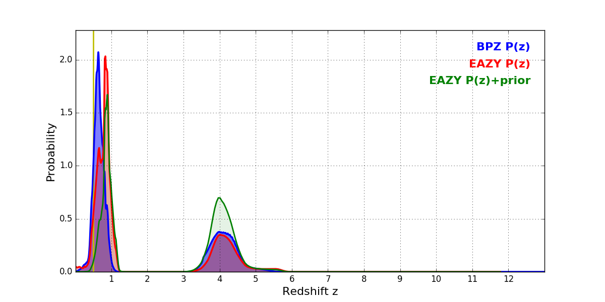 In P(z) plots: Yellow lines mark the cluster redshift z = 0.505,