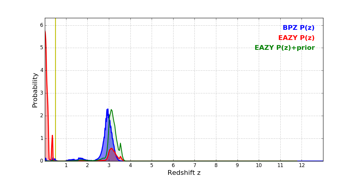 In P(z) plots: Yellow lines mark the cluster redshift z = 0.505,
