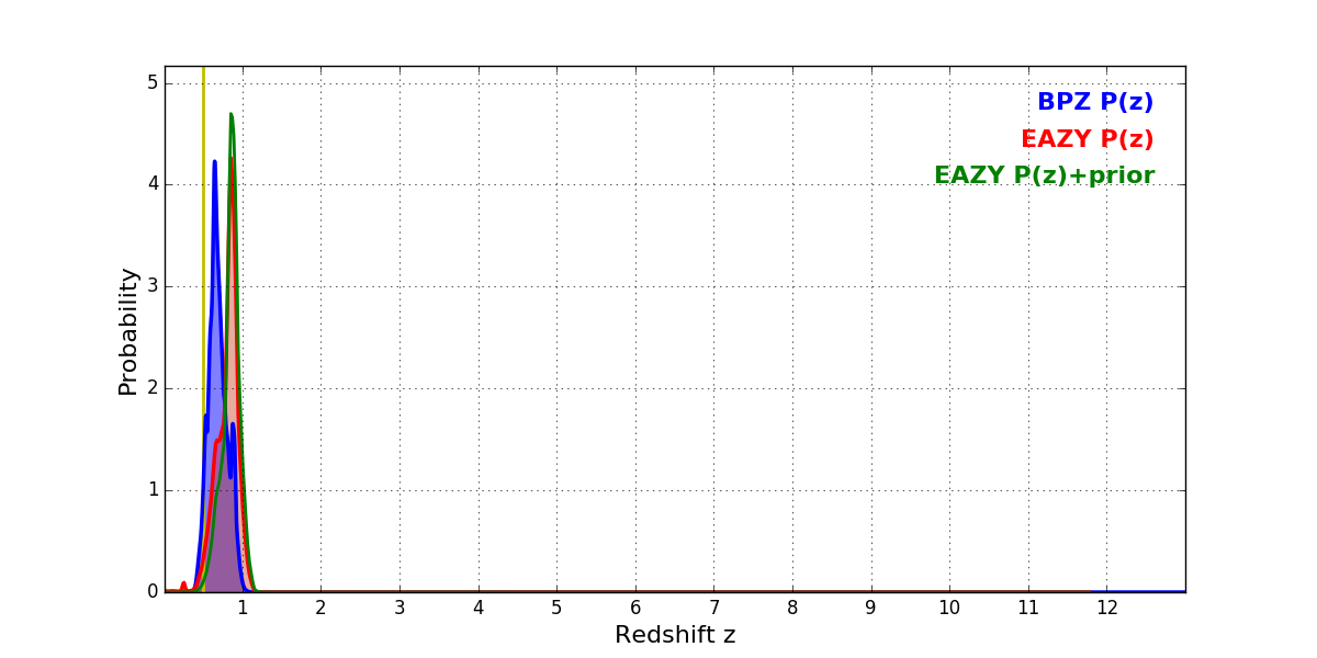 In P(z) plots: Yellow lines mark the cluster redshift z = 0.505,