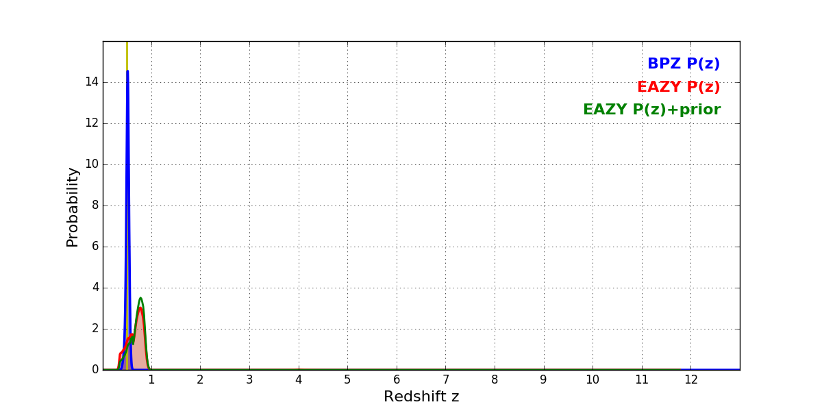 In P(z) plots: Yellow lines mark the cluster redshift z = 0.505,