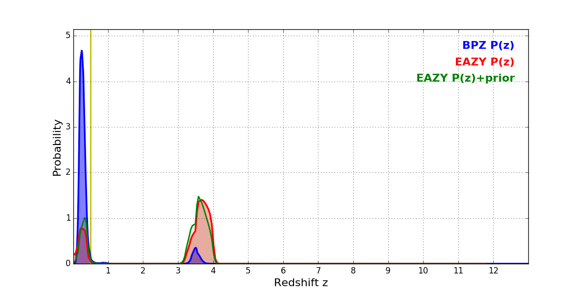 In P(z) plots: Yellow lines mark the cluster redshift z = 0.505,