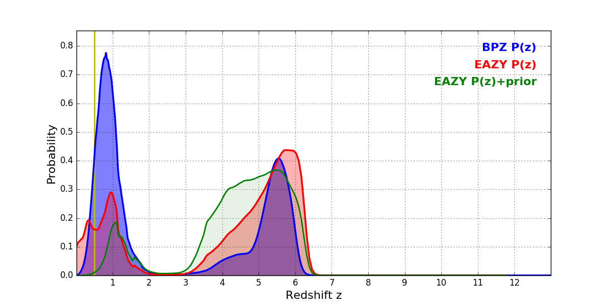In P(z) plots: Yellow lines mark the cluster redshift z = 0.505,