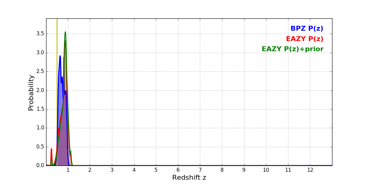 In P(z) plots: Yellow lines mark the cluster redshift z = 0.505,