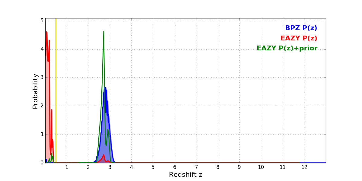 In P(z) plots: Yellow lines mark the cluster redshift z = 0.505,