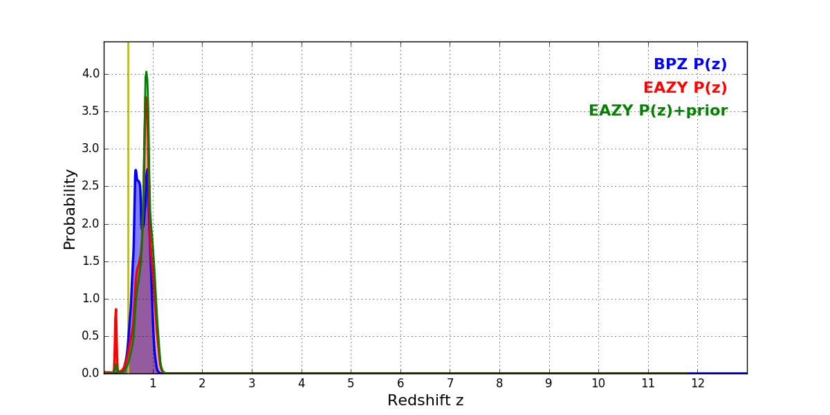 In P(z) plots: Yellow lines mark the cluster redshift z = 0.505,