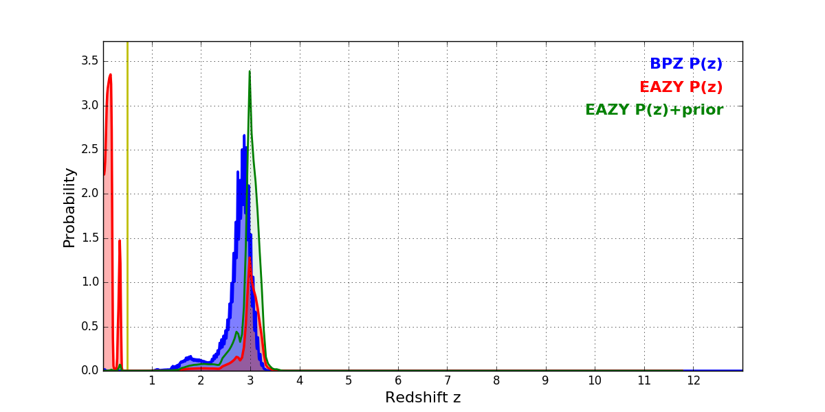 In P(z) plots: Yellow lines mark the cluster redshift z = 0.505,